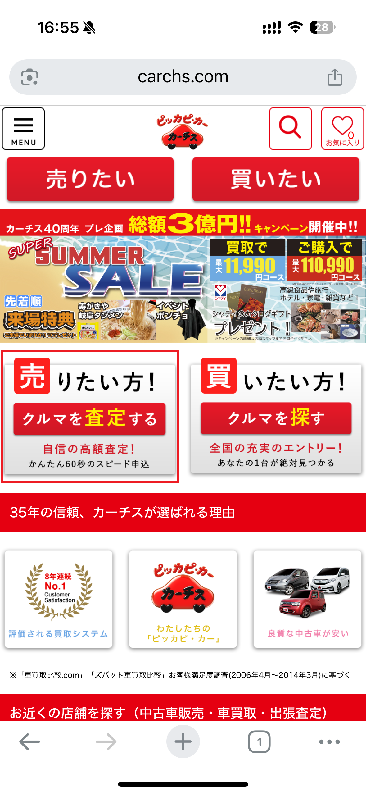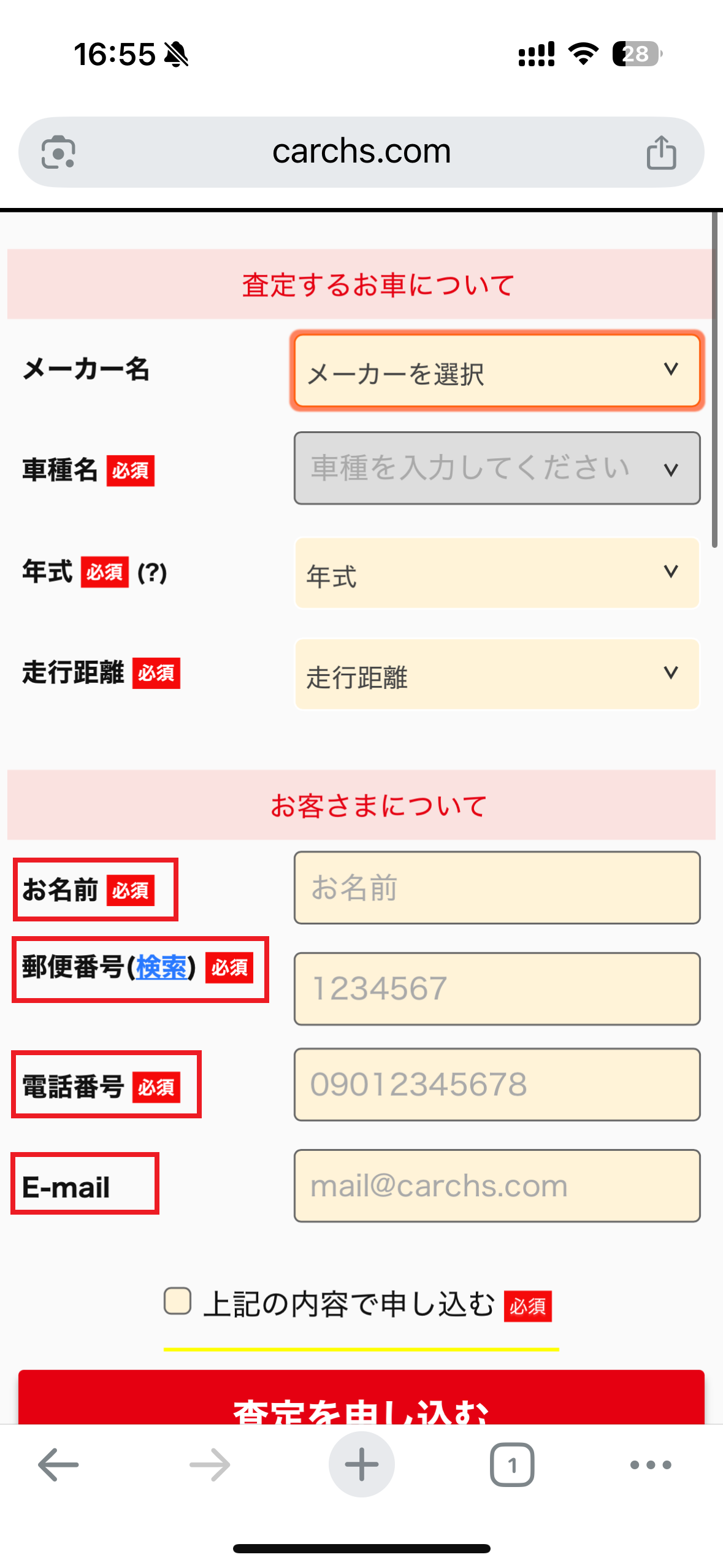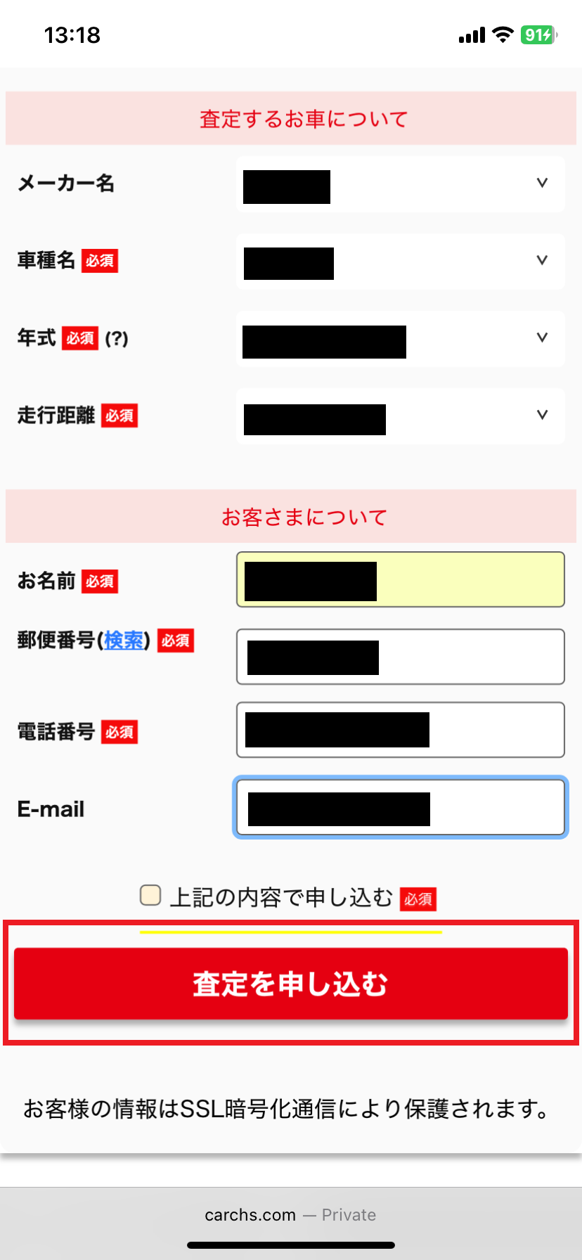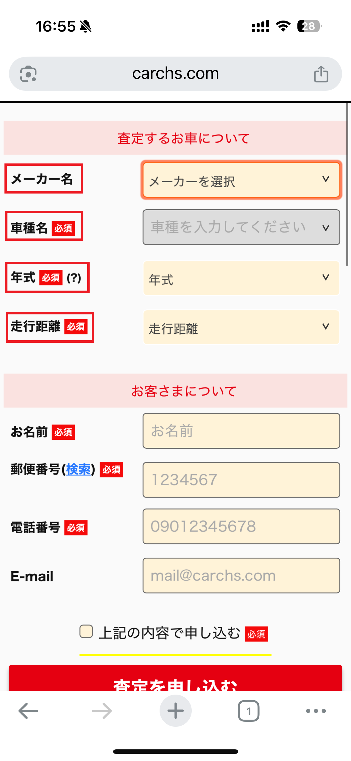 カーチスのサイトに入り、「売りたい方」をタップするとフォーム画面に変わります。