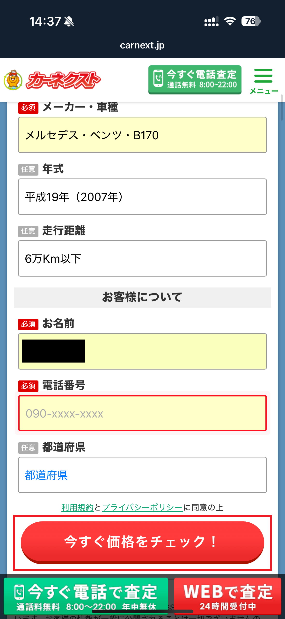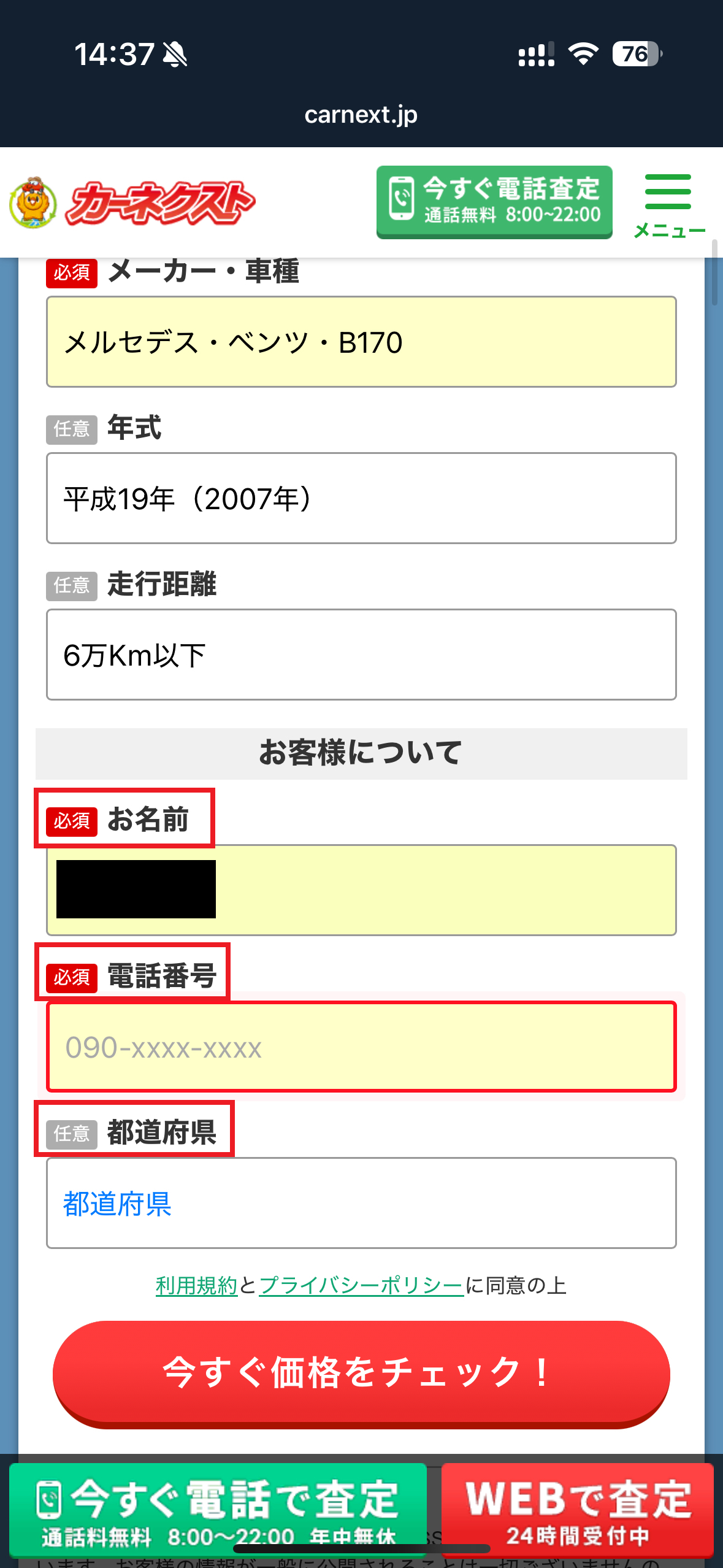 フォーム入力の後に電話が来て年式など聞かれるので、一応、車検証やメーターで走行距離を調べておくとスムーズです。