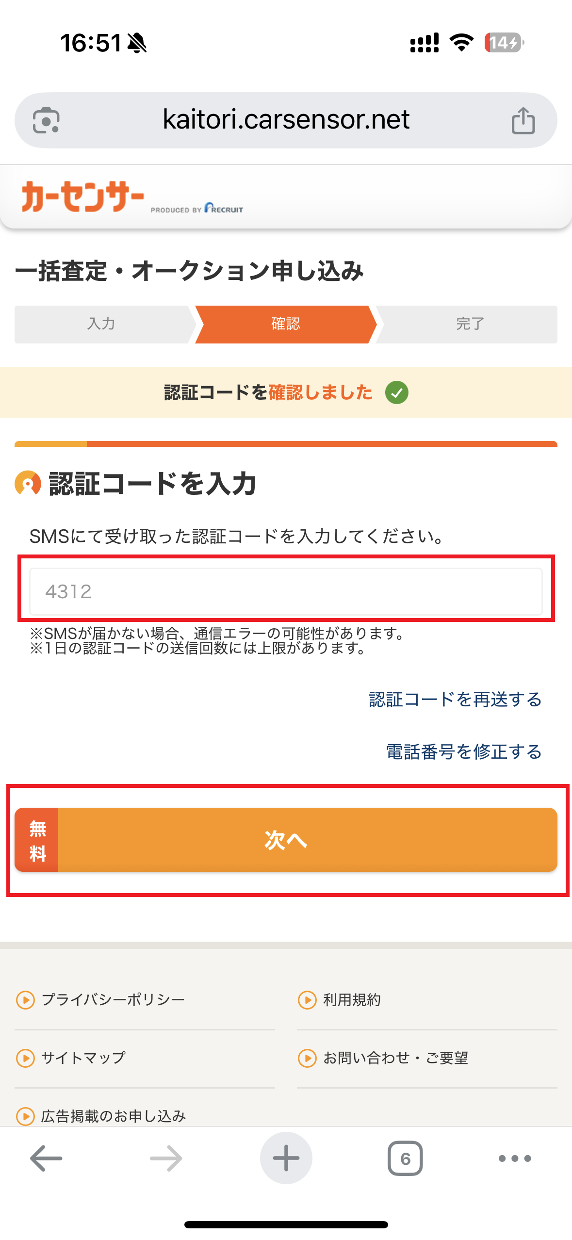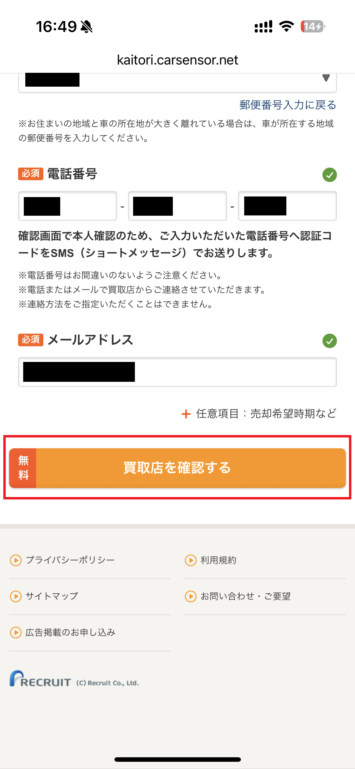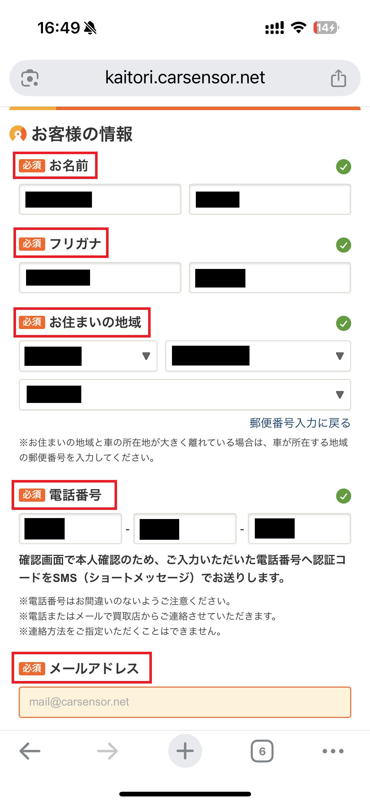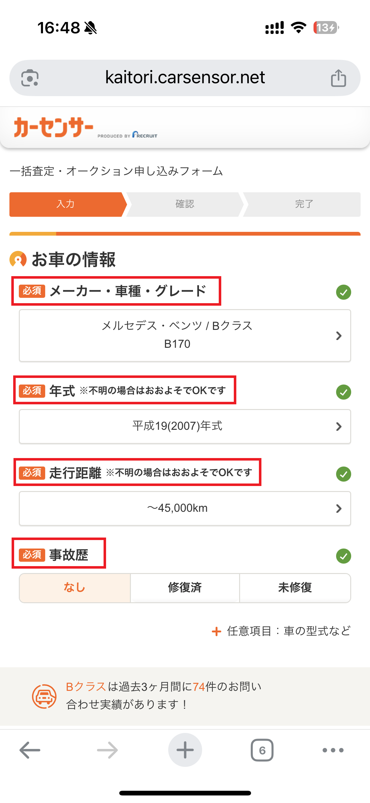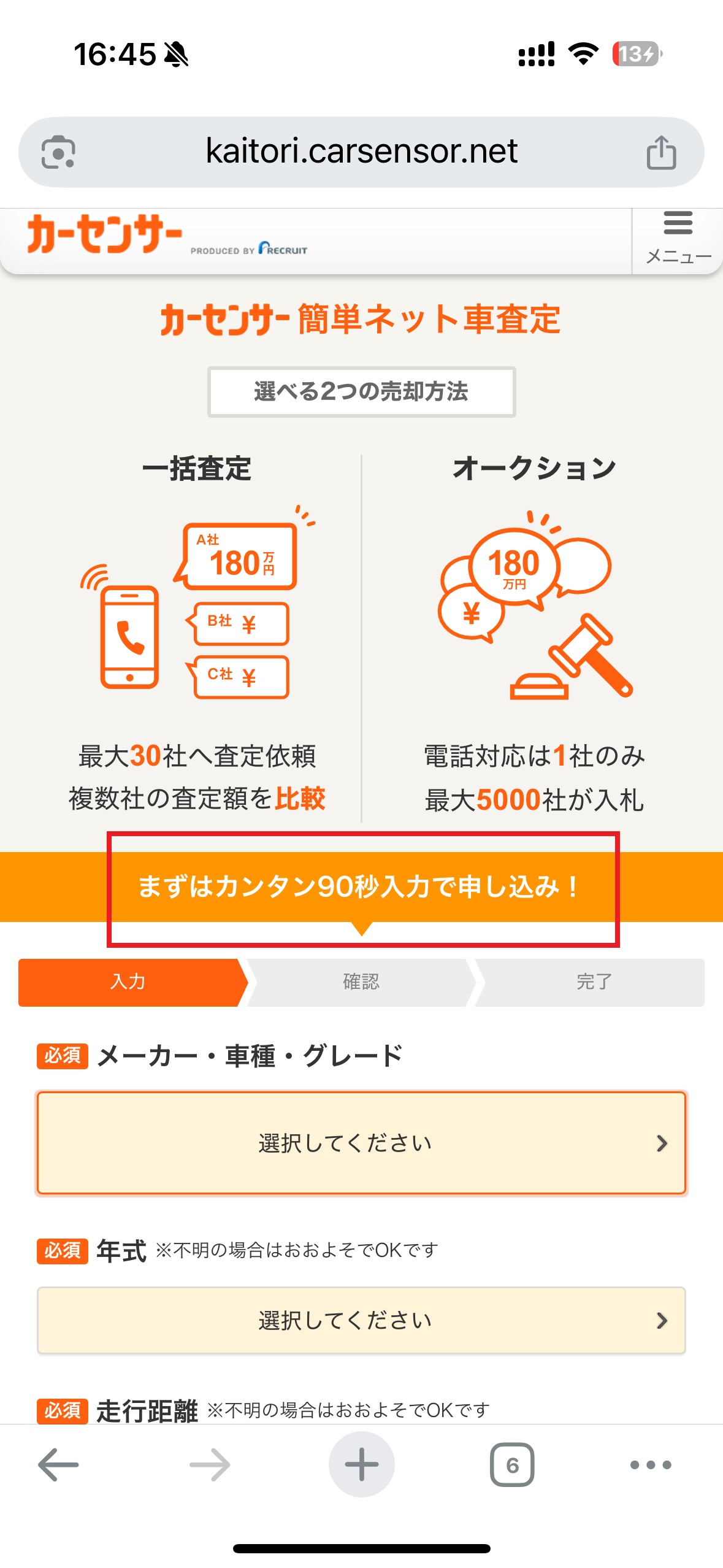 カーセンサーのサイトに入り、少しスクロールすると、入力フォームがあります。