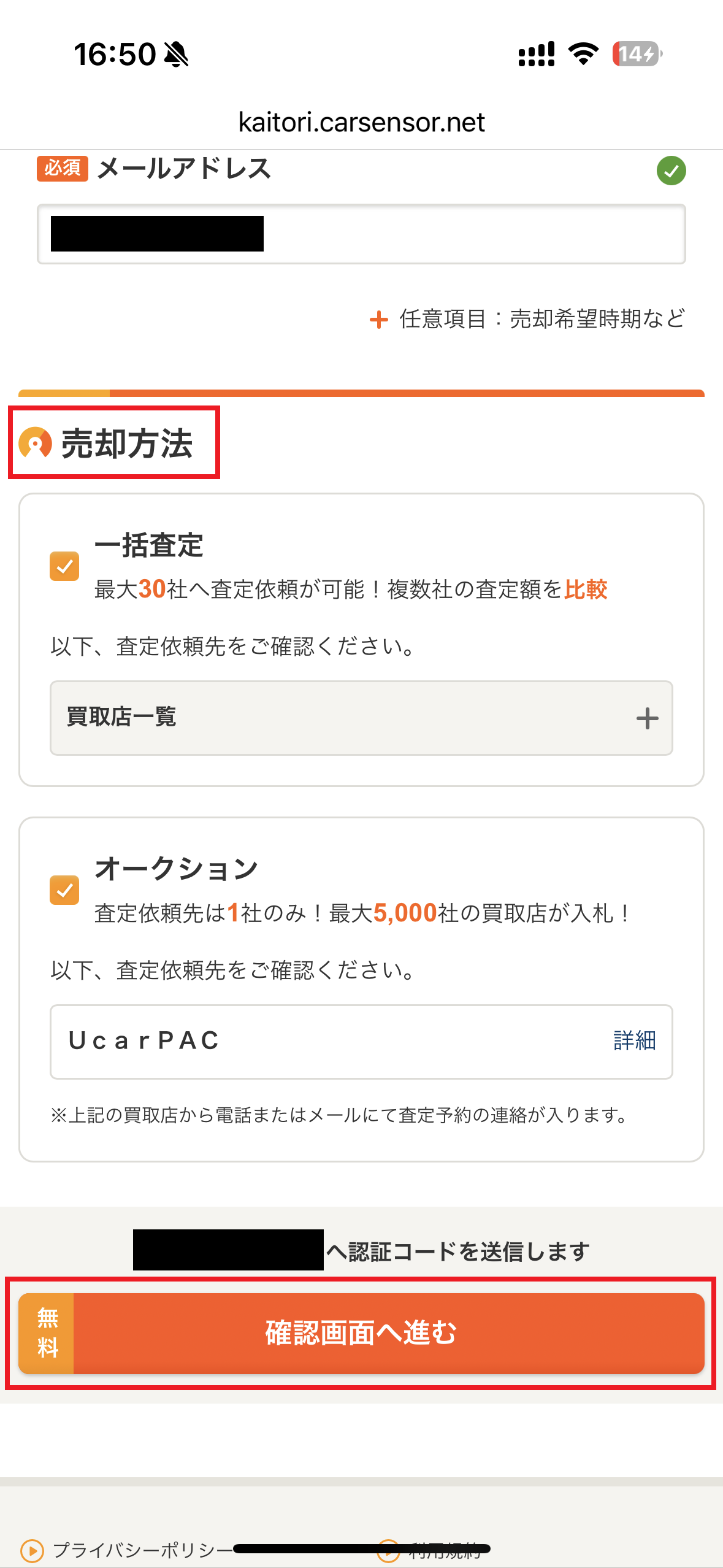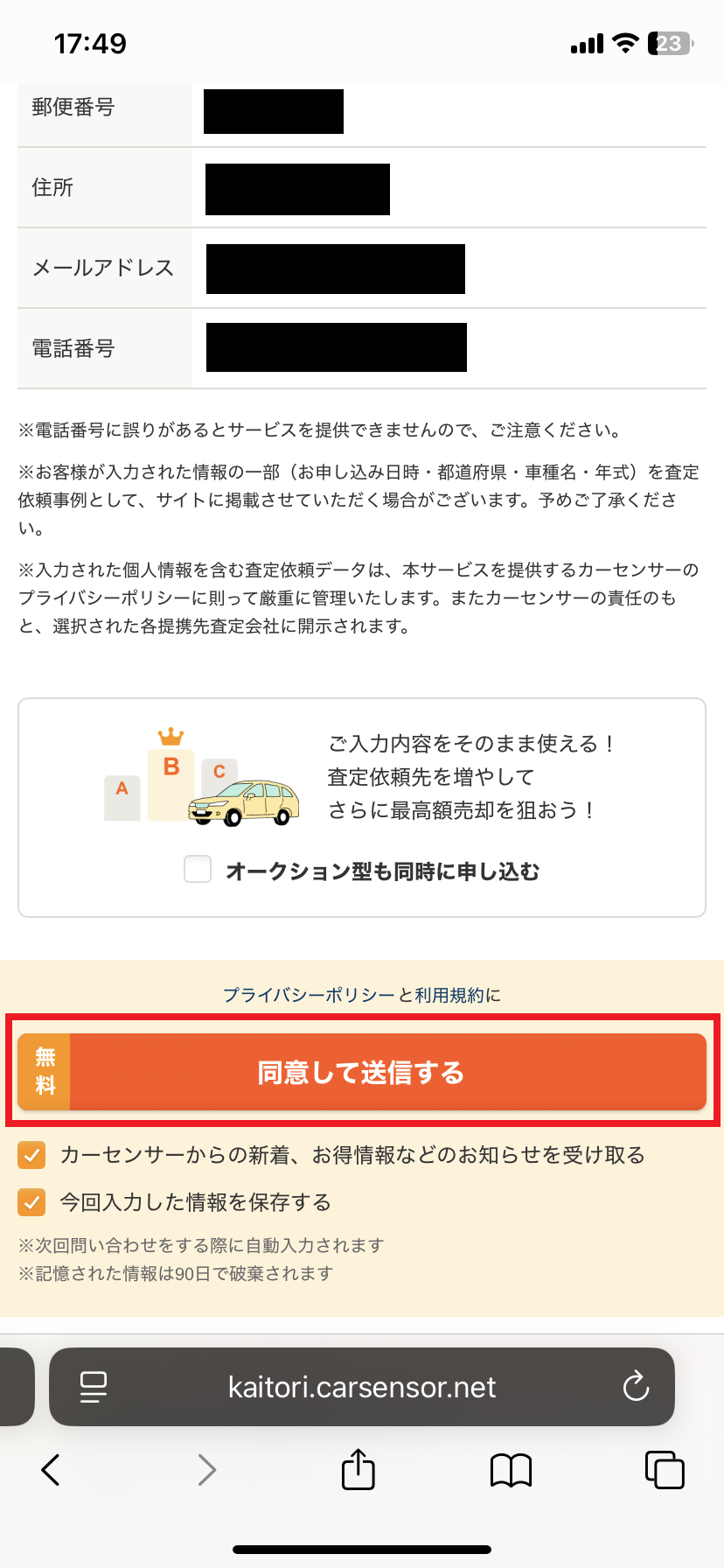 一括(複数社に申込み)かオークション(入札で勝ち取ったところからだけ連絡が来る)かが選べますが、オークションにしたら、競合他社のユーカーパックが出てきたので、カーセンサーのオリジナルではないのかと少々残念な気持ちに(調査時)。
