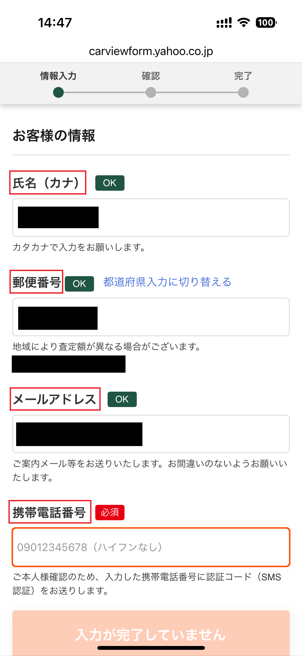 - 個人情報として聞かれることは「名前(カナ)」「郵便番号」「メールアドレス」「携帯電話番号」