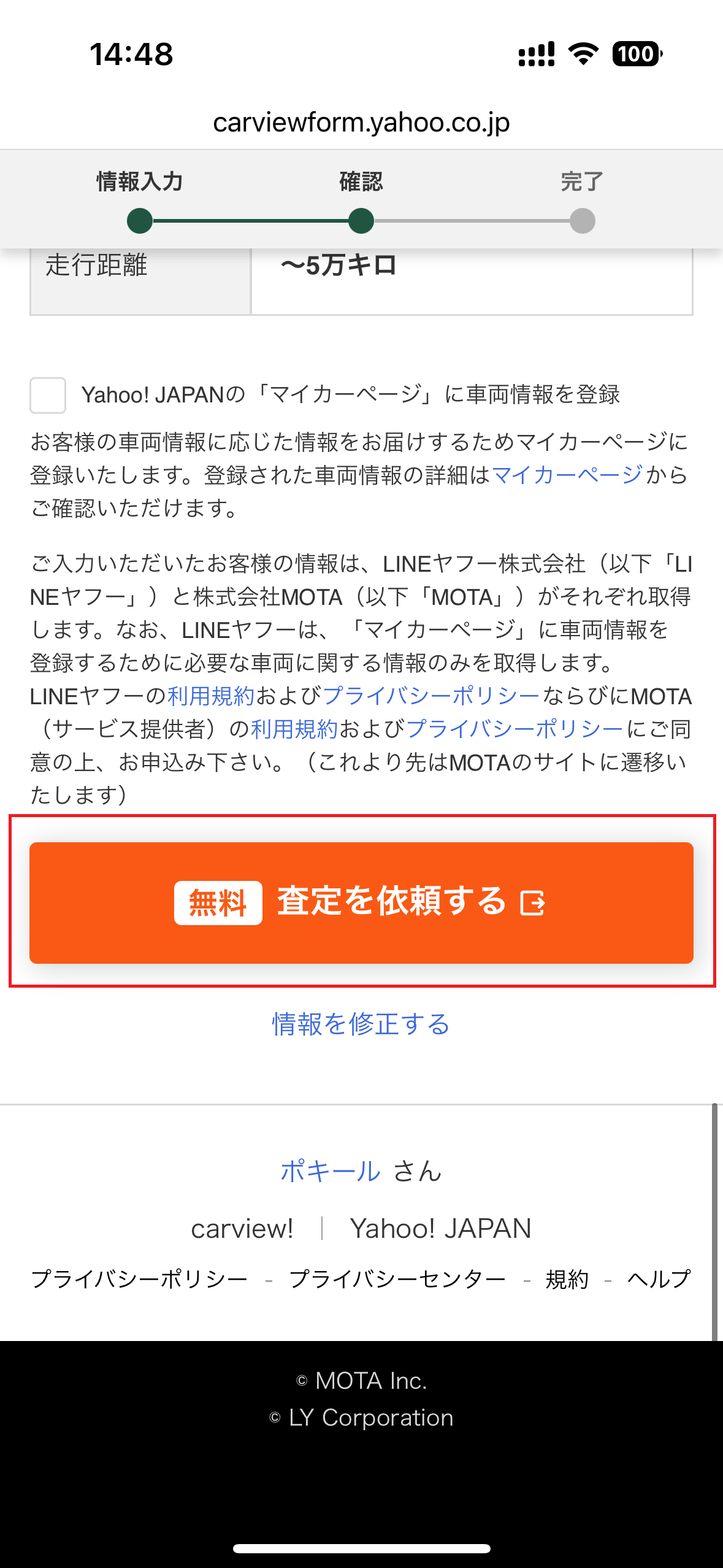 申込みを進めると、最終的に「MOTA」の画面に遷移します。事前に「カービューで申し込んだつもり」でも、実際はMOTA経由で連絡が来る流れになっているようなので、やや戸惑う方もいるかもしれません。