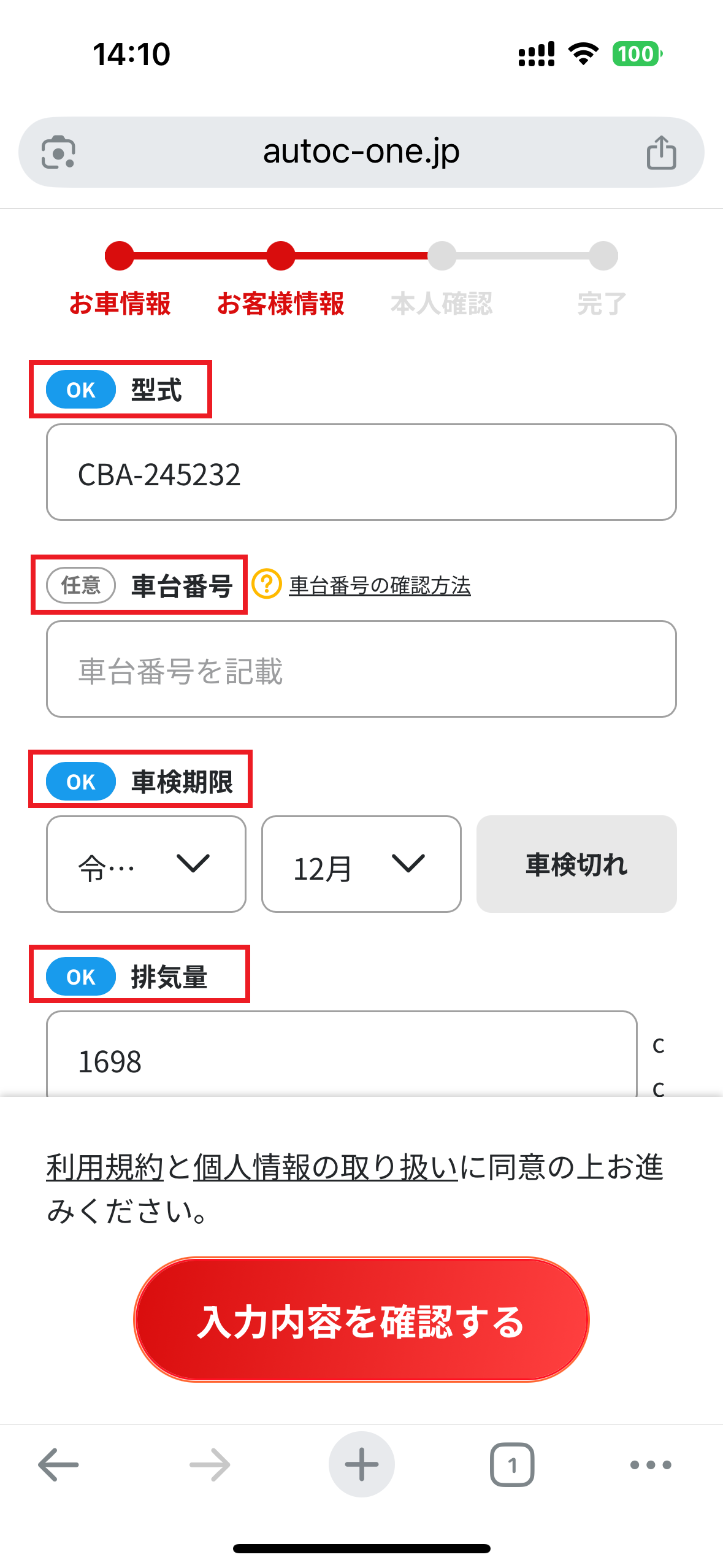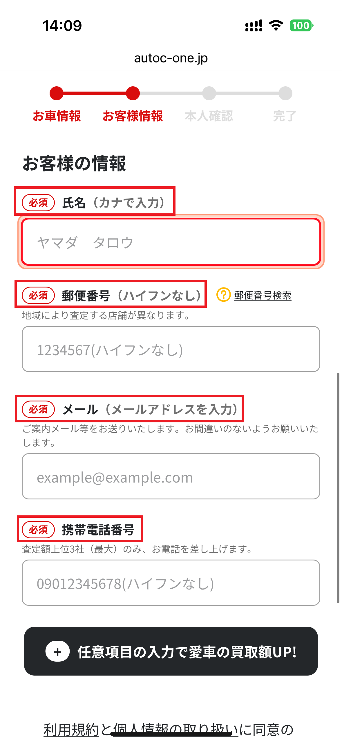 - 続いて個人情報「名前」「メールアドレス」「電話番号」「郵便番号」