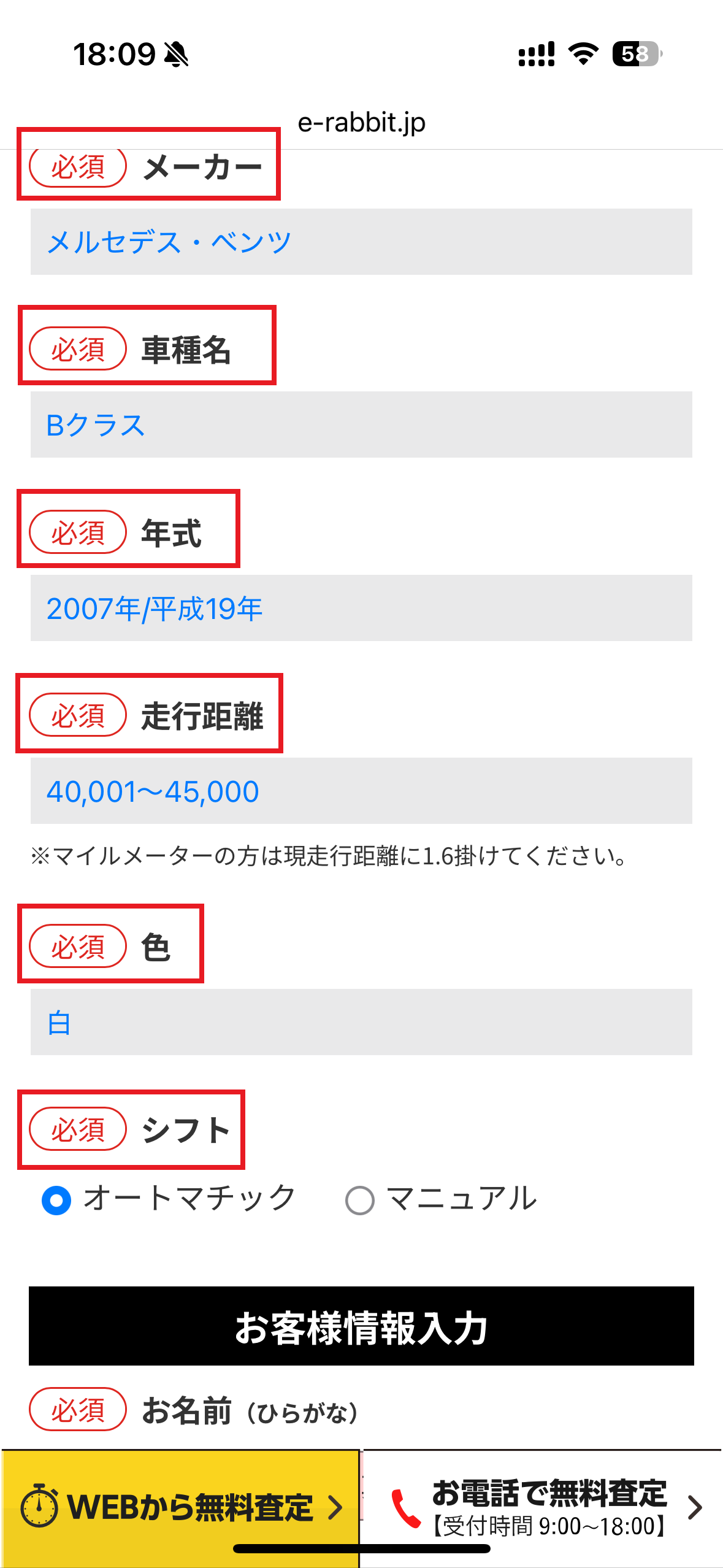 - 聞かれることは「メーカー」「車種」「年式」「走行距離」「色」「シフト」