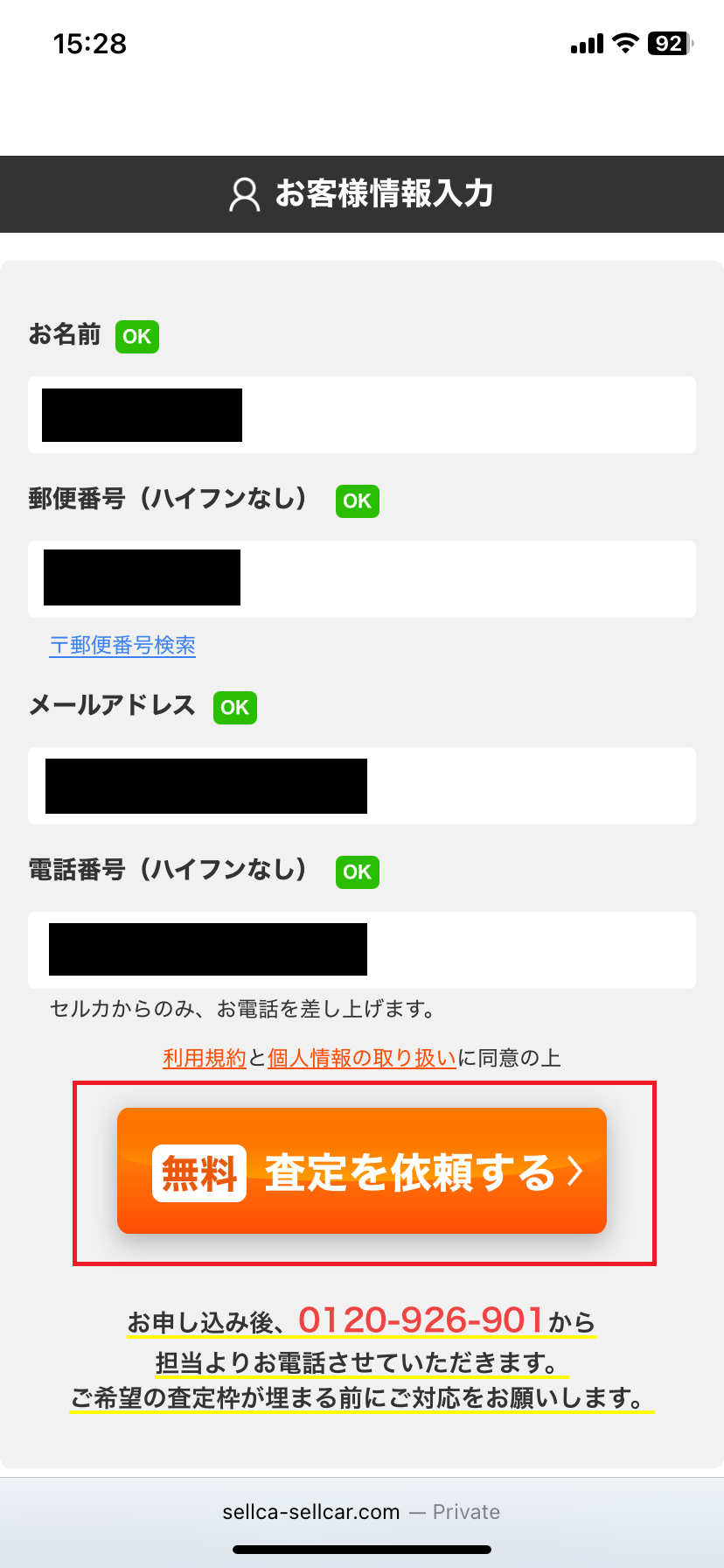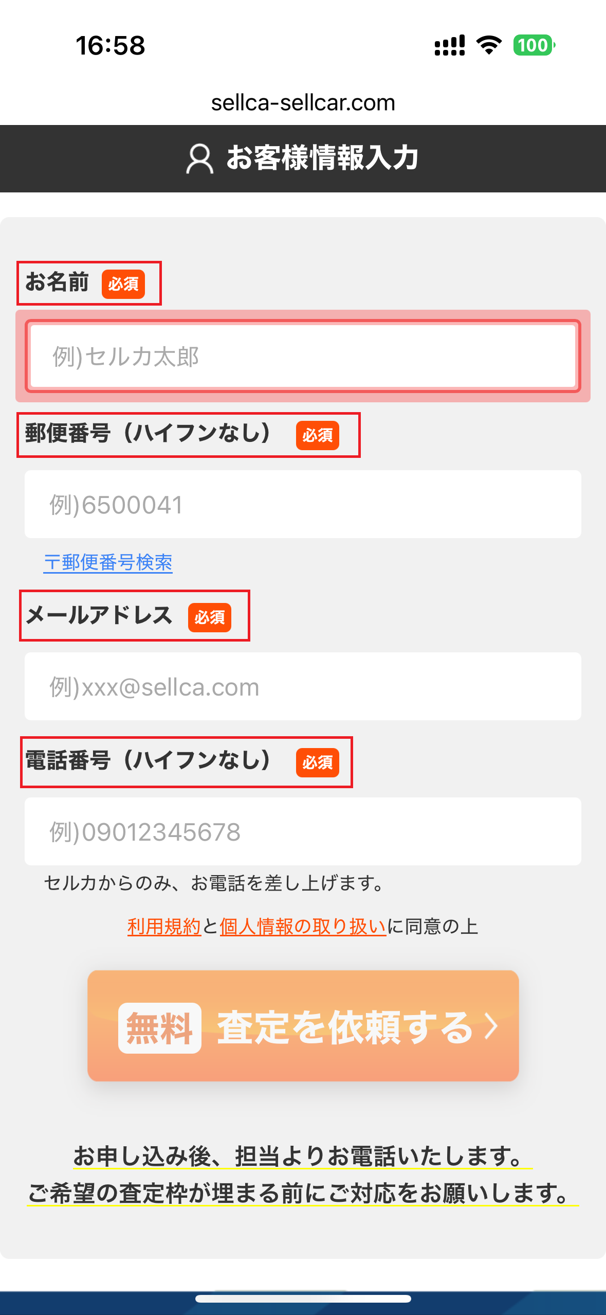 - ここまで入れて、無料査定を依頼するボタン