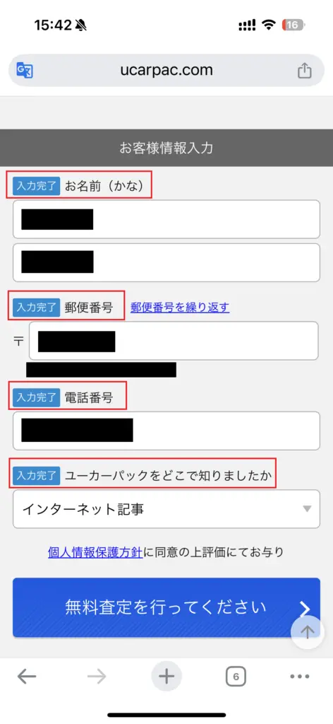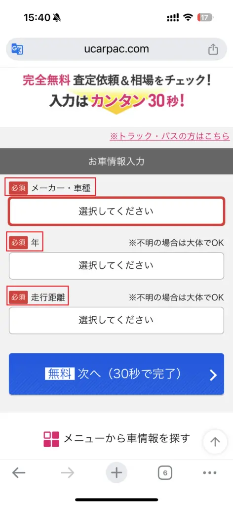 - 聞かれることは「メーカー」「車種」「年式」「走行距離」「ユーカーパックをどこで知ったか」