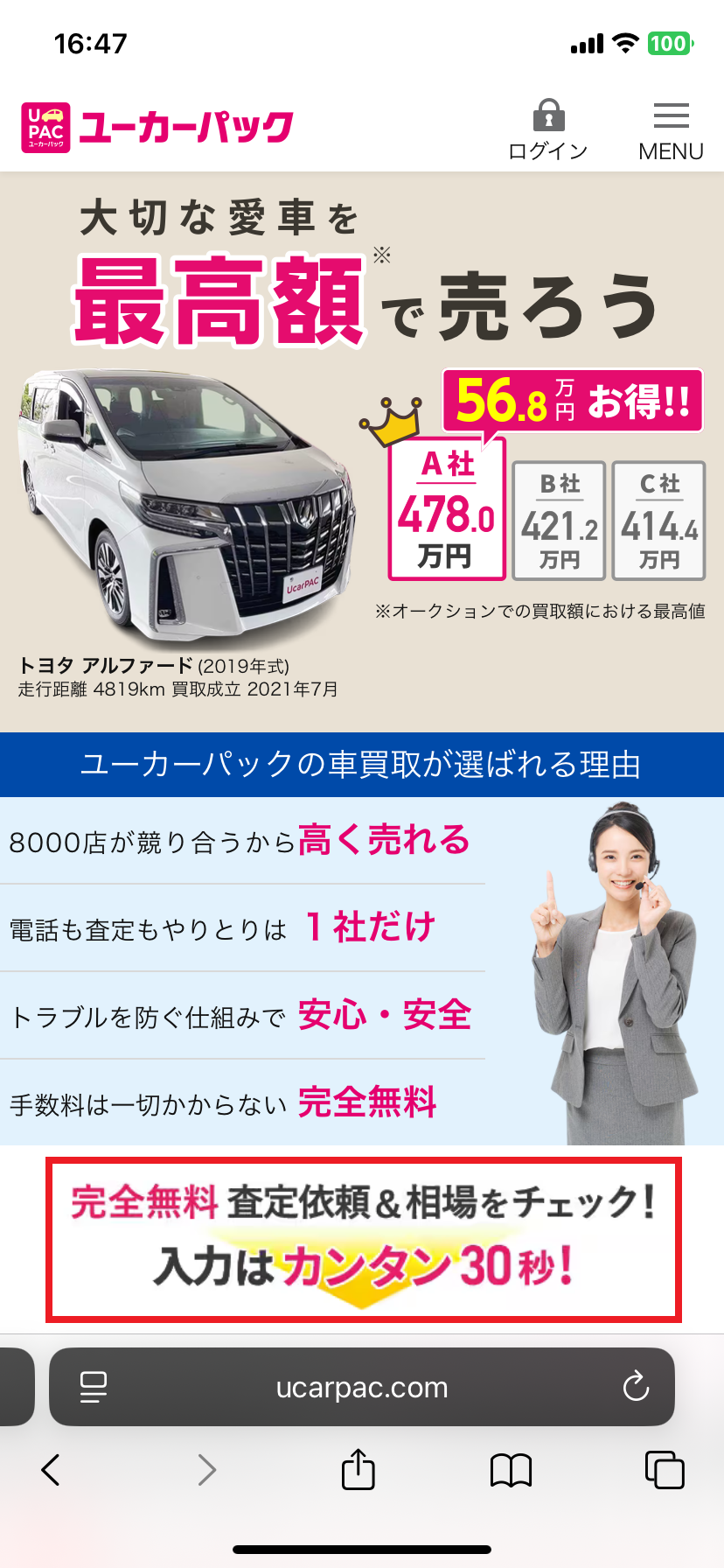 「車のプロである買取業者から営業を受けたり、商談したりするのってかなり大変ですよね。しかもそれを複数社となると、さらに困難になることでしょう。ユーカーパックのサービスは簡単かつ安心で、しかも楽に車が高く売れる仕組みを提供しております。これらのワードに興味がある方はぜひ1度ご利用をご検討くださいませ。」